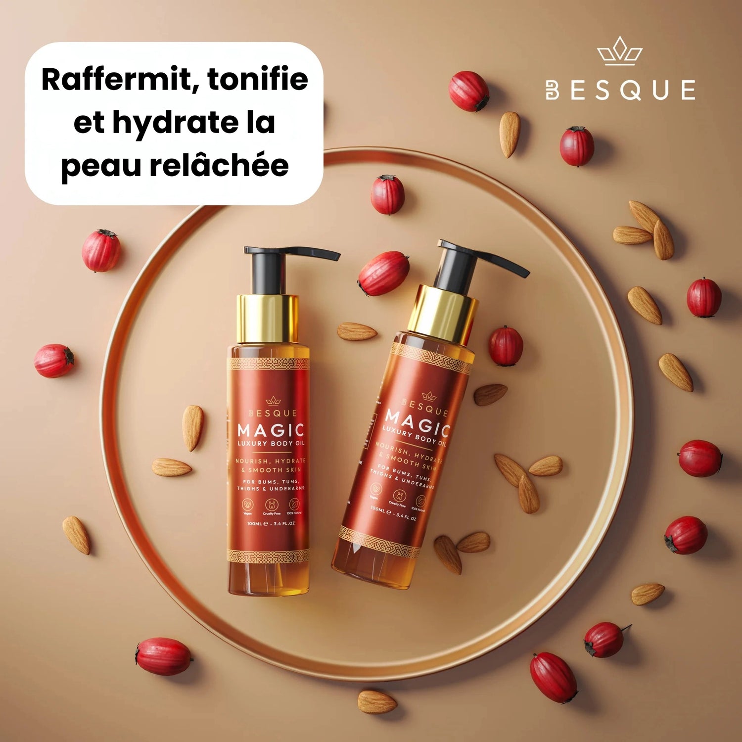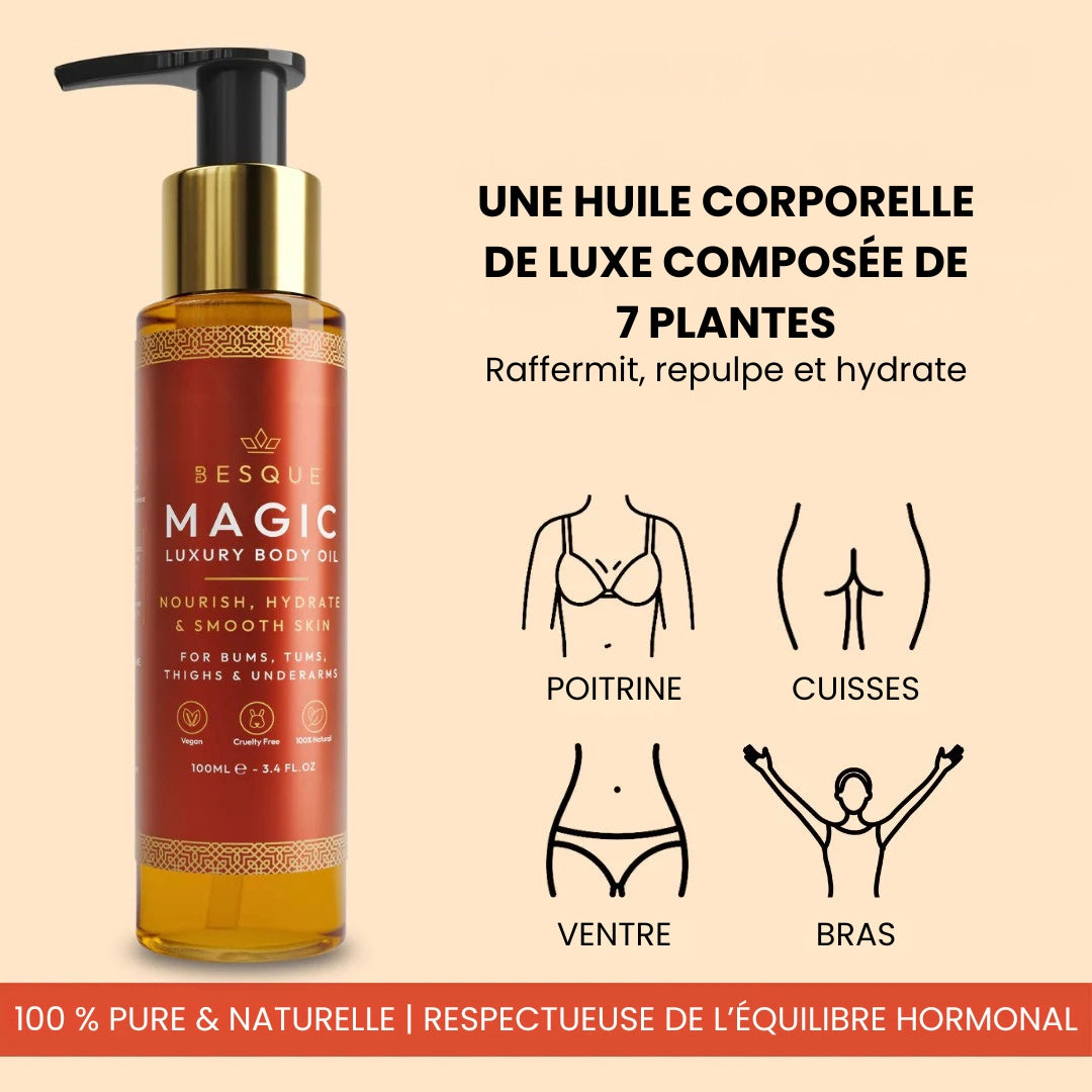 Une huile corporelle de luxe, formulée à partir de 7 huiles végétales pressées à froid, qui raffermit, repulpe et hydrate la peau en profondeur.