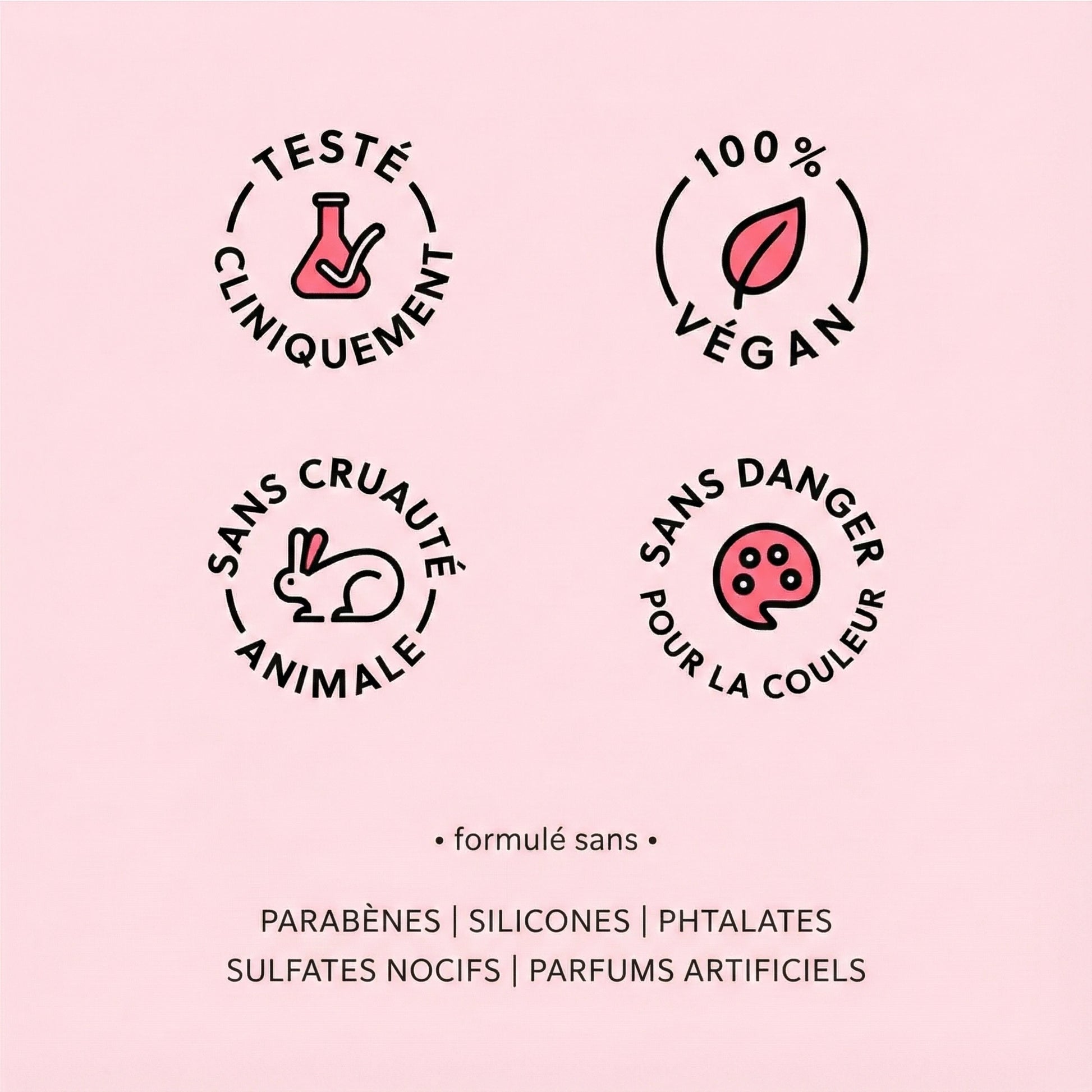 Notre formule est spécifiquement conçue pour être douce et sans danger pour tous. Nos produits ne contiennent pas de parabènes et sont également sans gluten et vegan. Cependant, évitez tout contact avec les yeux. En cas de contact, rincez abondamment à l'eau claire.